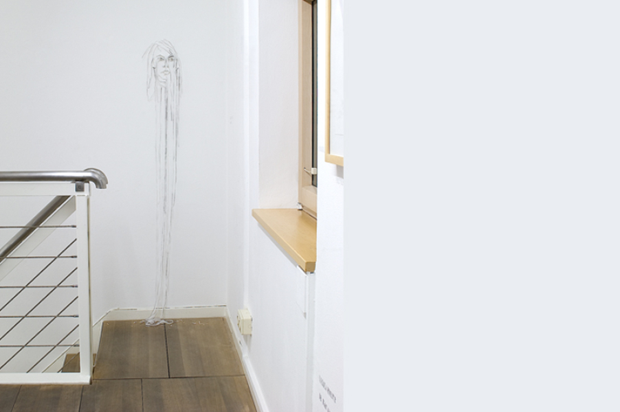 Zitat und Sampling prägen auch fan you III, Fadenreste der Arbeit fiat lux werden direkt an der Wand zu einer textilen Zeichnung montiert, wobei lose Enden und Verschnitt einfach liegen bleiben. Seitlich betrachtet entsteht der Eindruck einer Fratze, von weitem wirkt fan you III wie ein klassisches Portrait. (Fotografien Bruno Weiss) 2009