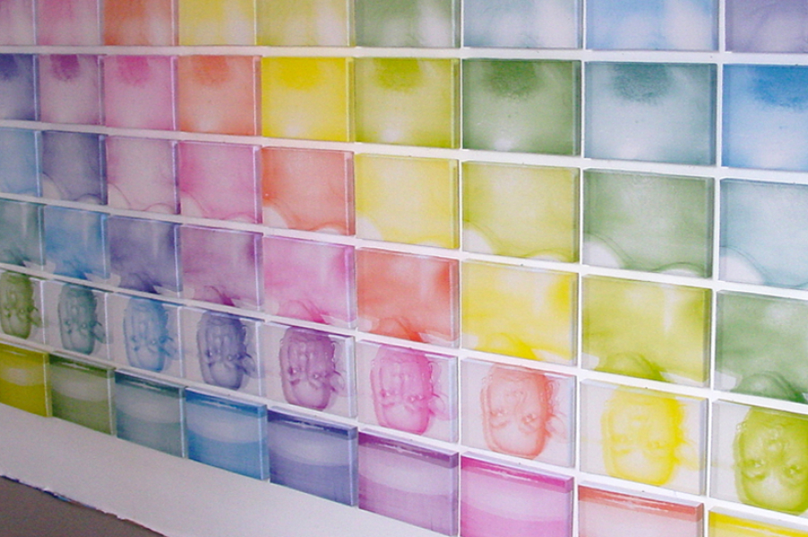 Ich fotografiere mich selbst von Kopf bis Fuß, in der Badewanne liegend. Doch dieses Selbstportrait verbirgt mehr, als es enthüllt, denn es besteht aus fragmentierten Ansichten meines Körpers. So reflektiert farbbad die Einheit der Person, löst diese aber gleichzeitig auf: Aus neun Motiven in jeweils neun Farbtönen ergibt sich ein modulares oder auch serielles System von 81 Textildrucken, die im Siebdruckverfahren umgesetzt und auf Objektkästen aufgezogen sind.